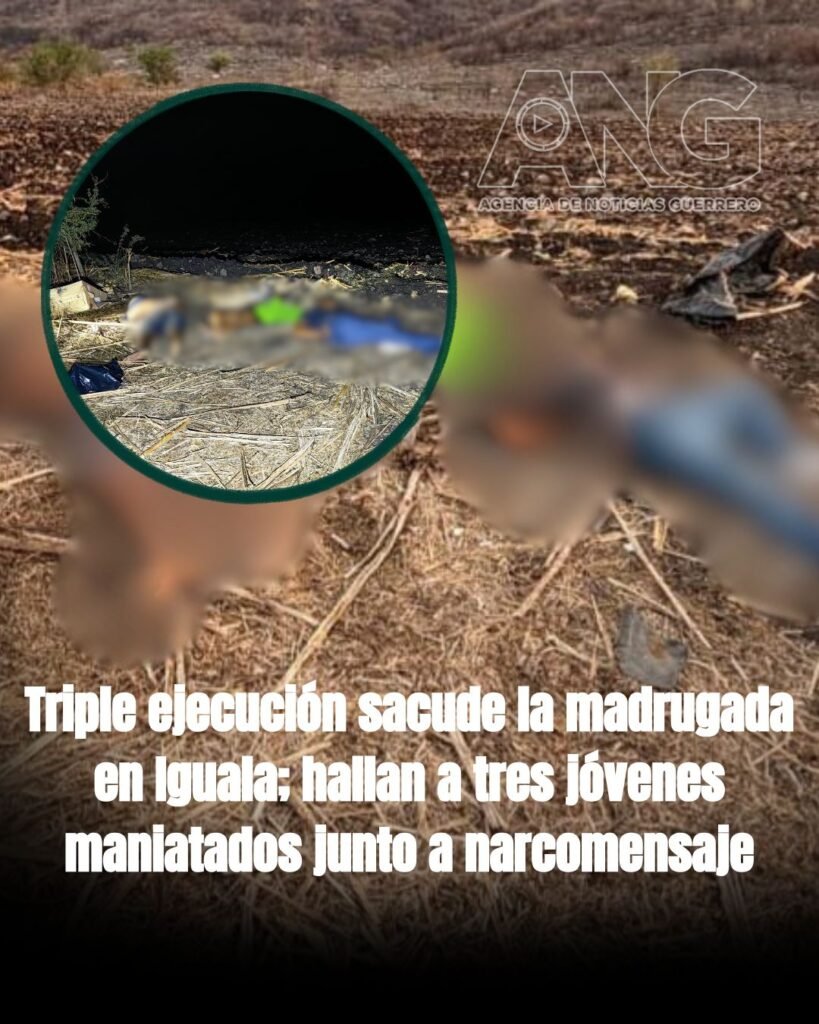 Iguala de la Independencia, Gro., 30 de abril de 2026. Agencia de Noticias Guerrero (ANG).— La violencia volvió a irrumpir con crudeza en Iguala tras el hallazgo de tres personas sin vida, atadas y con impactos de arma de fuego, entre ellas una mujer, a un costado de la carretera hacia Teloloapan, cerca del puente de Cocula. Junto a los cuerpos fue dejada una cartulina con señalamientos que los vinculan presuntamente con la venta de droga.