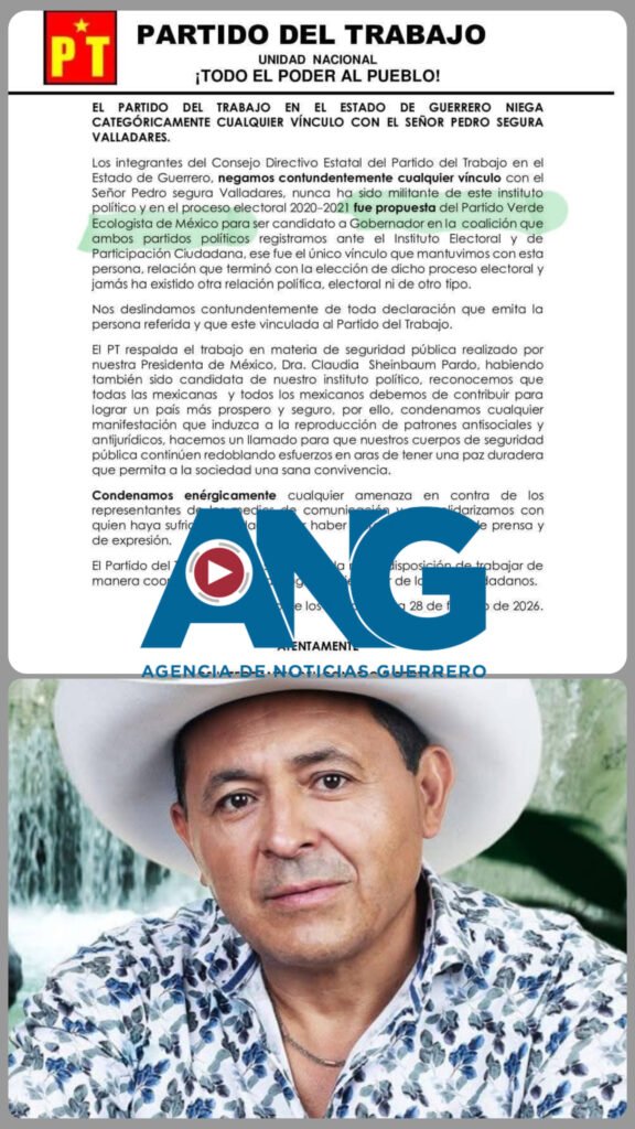 Chilpancingo, Gro., 28 de febrero de 2026.– El Consejo Directivo Estatal del Partido del Trabajo (PT) en Guerrero negó de manera categórica cualquier vínculo político, electoral o de otra índole con el ciudadano Pedro Segura Valladares.