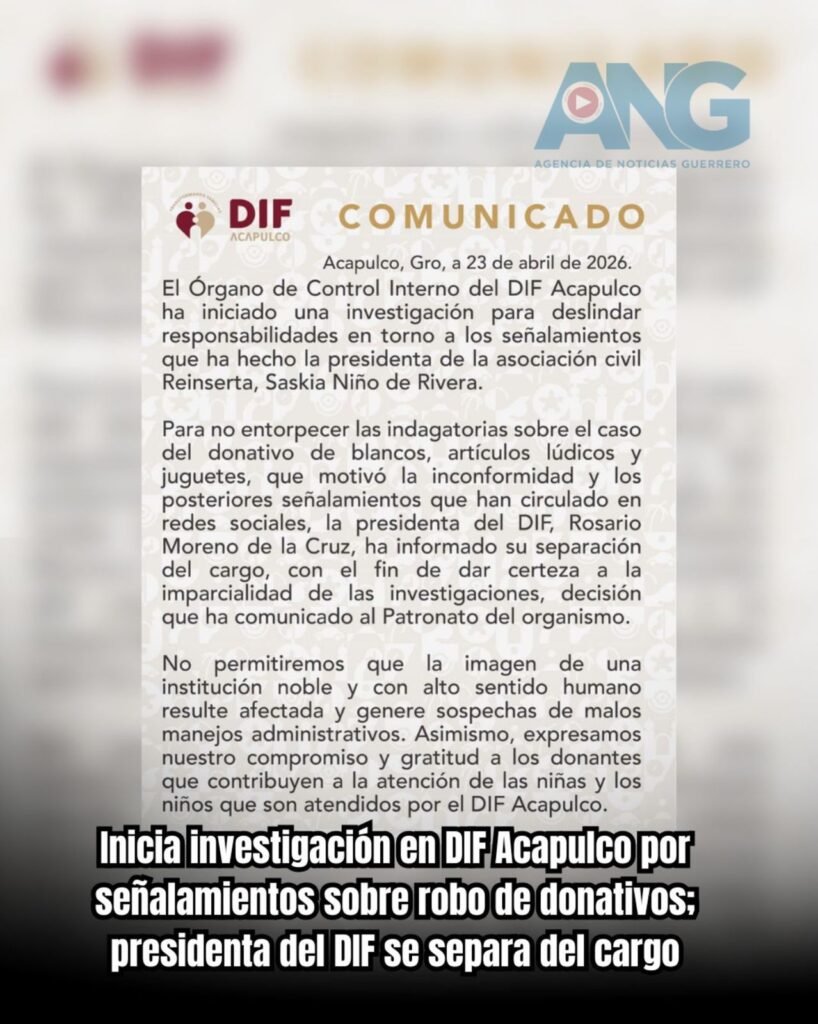 Acapulco, Gro., 23 de abril de 2026.Agencia de Noticias Guerrero (ANG). — El Órgano de Control Interno del Sistema para el Desarrollo Integral de la Familia (DIF) Acapulco informó el inicio de una investigación para deslindar responsabilidades ante los señalamientos realizados por la activista Saskia Niño de Rivera, relacionados con el manejo de donativos.