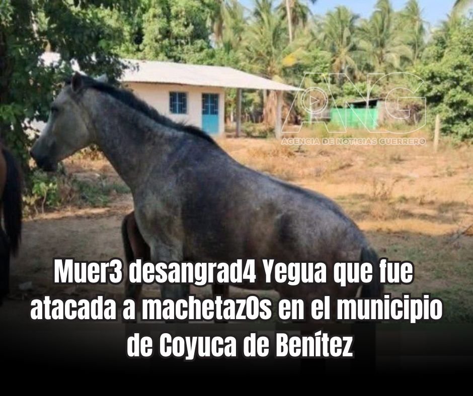 Coyuca de Benítez, Gro; 17 de abril de 2026. Agencia de Noticias Guerrero (ANG). – La yegua que fue brutalmente atacada machetazos por un tipejo, durante la madrugada del jueves en la comunidad de Los Cimientos Coyuca de Benítez, murió a causa de las graves heridas que sufrió, lo que generó la indignación entre habitantes de la zona.