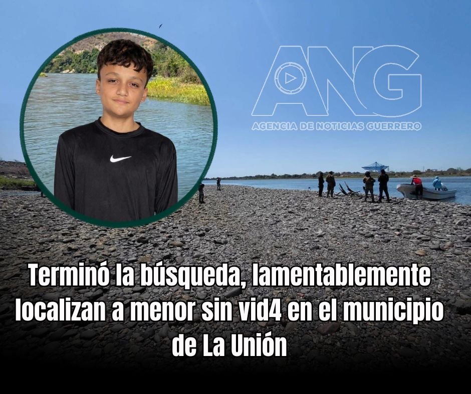 La Unión, Gro; 01 de abril de 2026. Agencia de Noticias Guerrero (ANG).- Tras casi 48 horas de una intensa búsqueda, fue localizado poco antes de las cuatro de la tarde de este día, el cuerpo sin vida del joven adolescente Andrés Sanchez de entre 12 a 14 años de edad, quien murió ahogado mientras nadaba en uno de los brazos del río Balsas, a la altura de la comunidad Las Tamacuas, perteneciente al municipio de La Unión de Isidoro Montes de Oca.